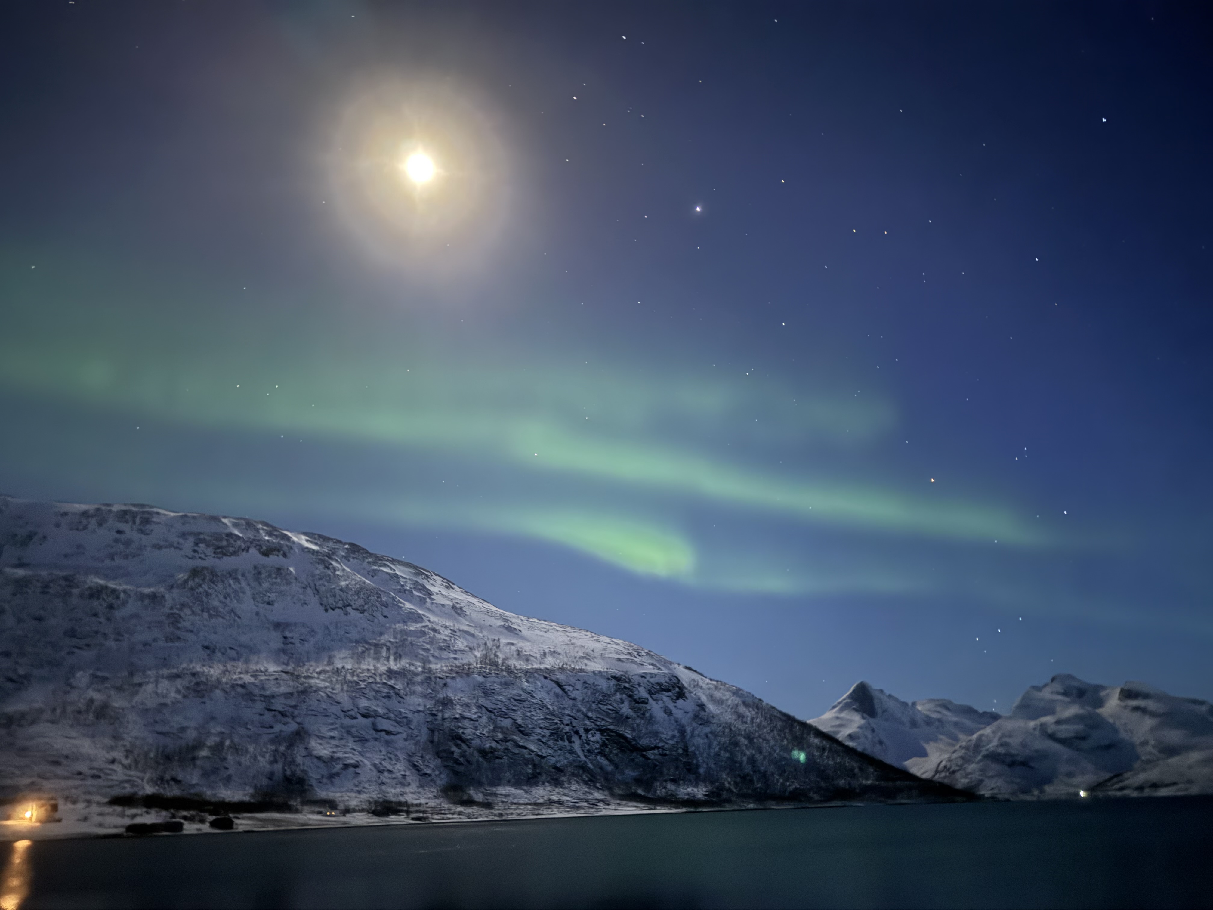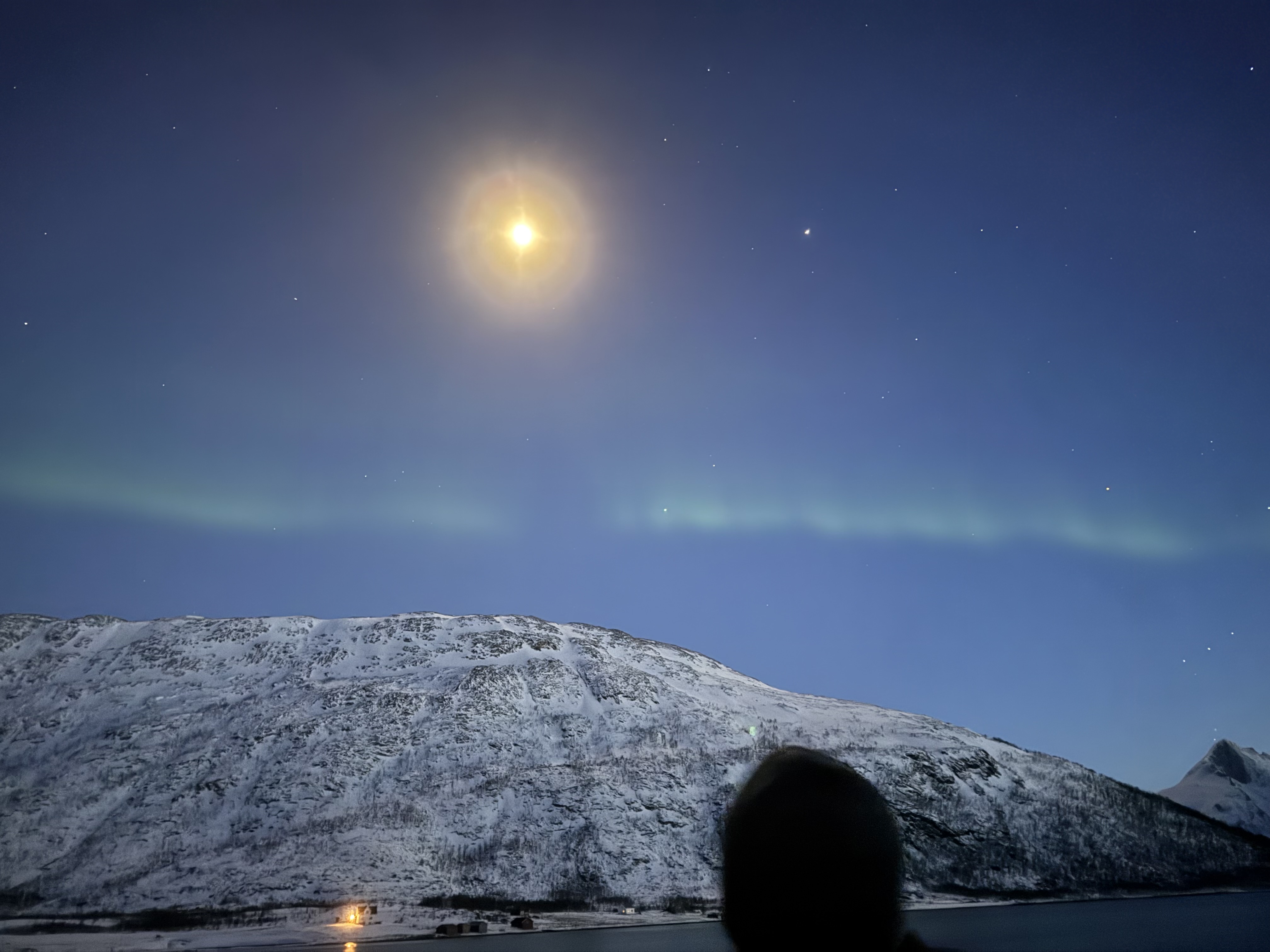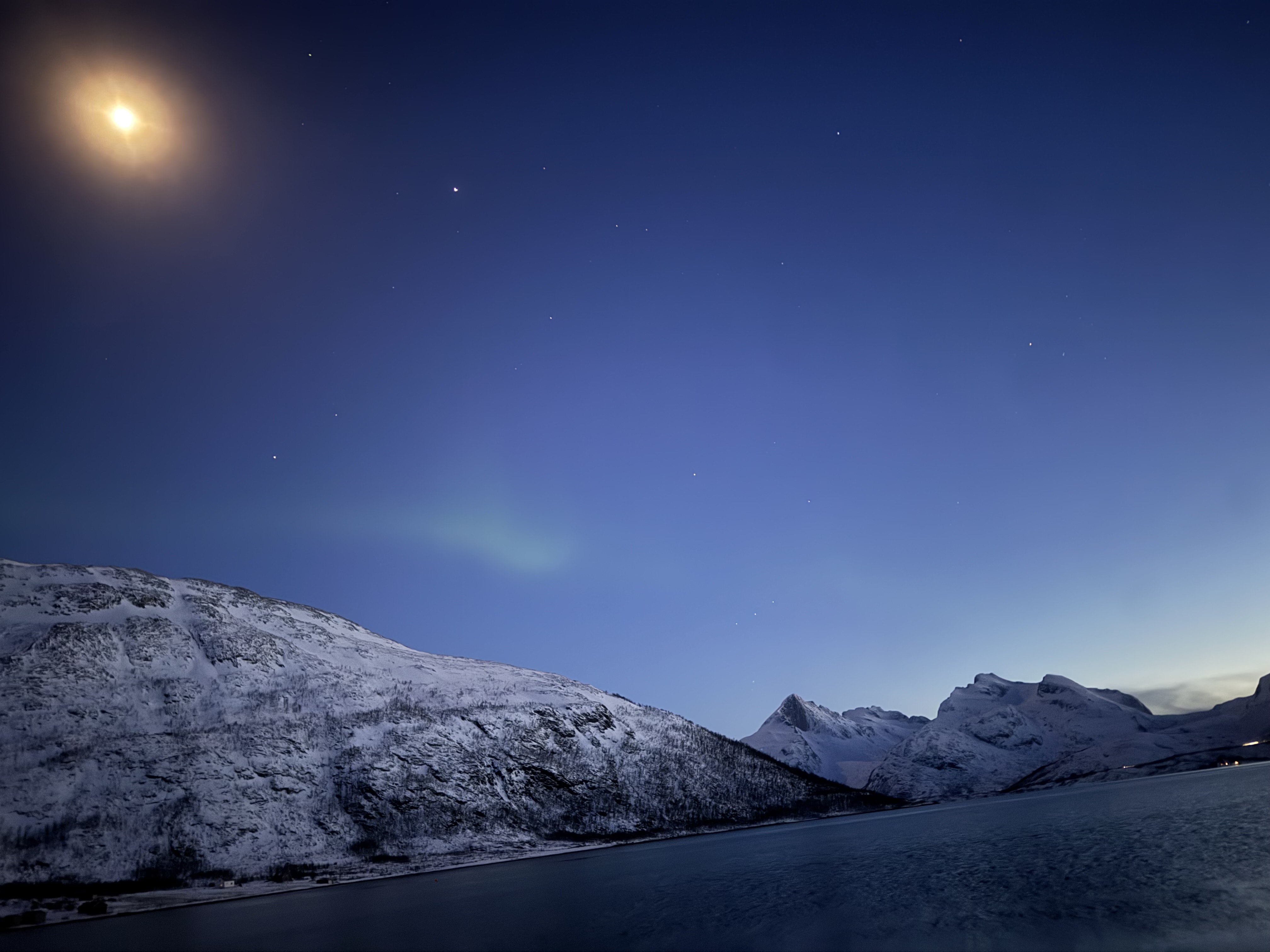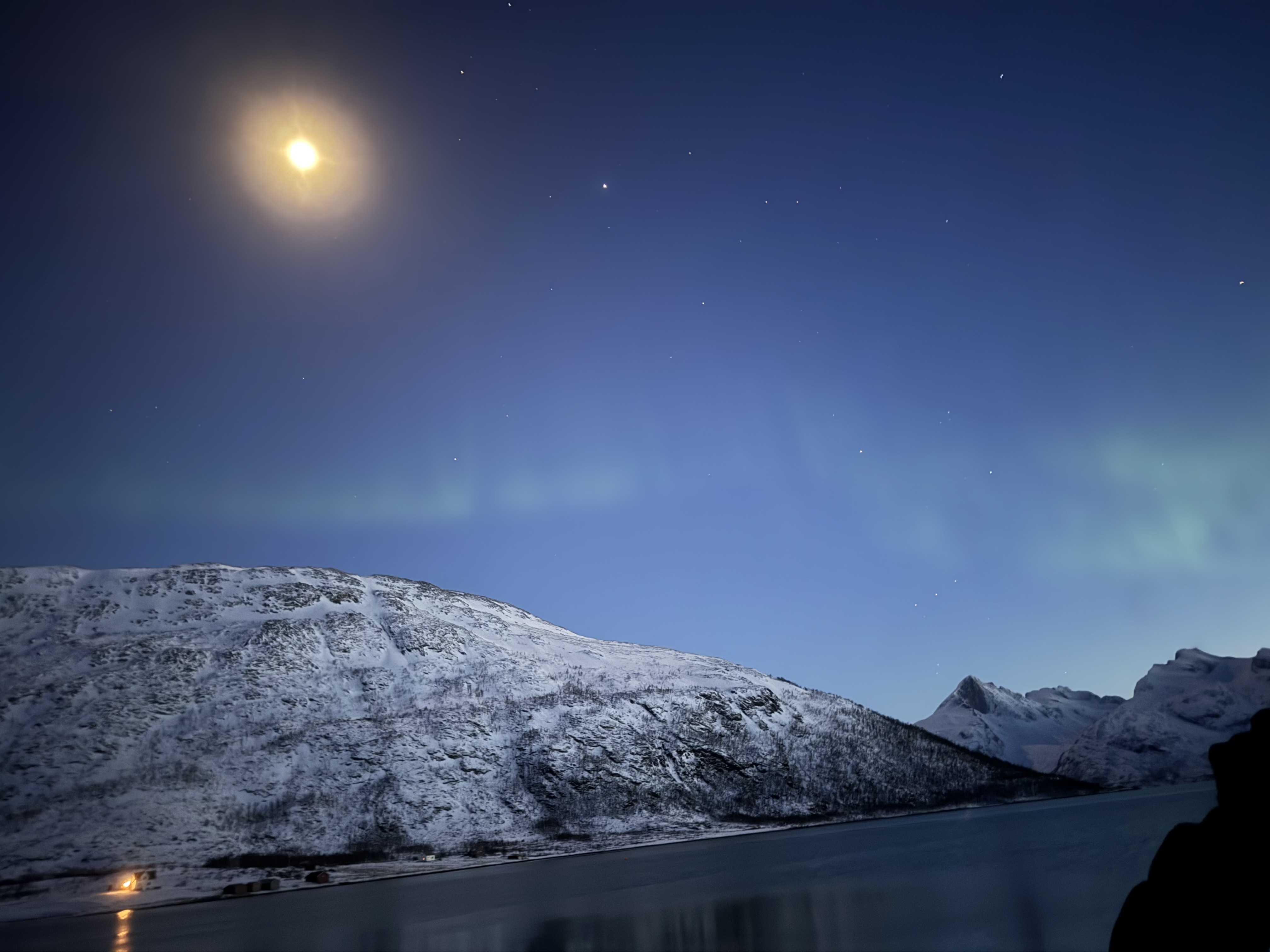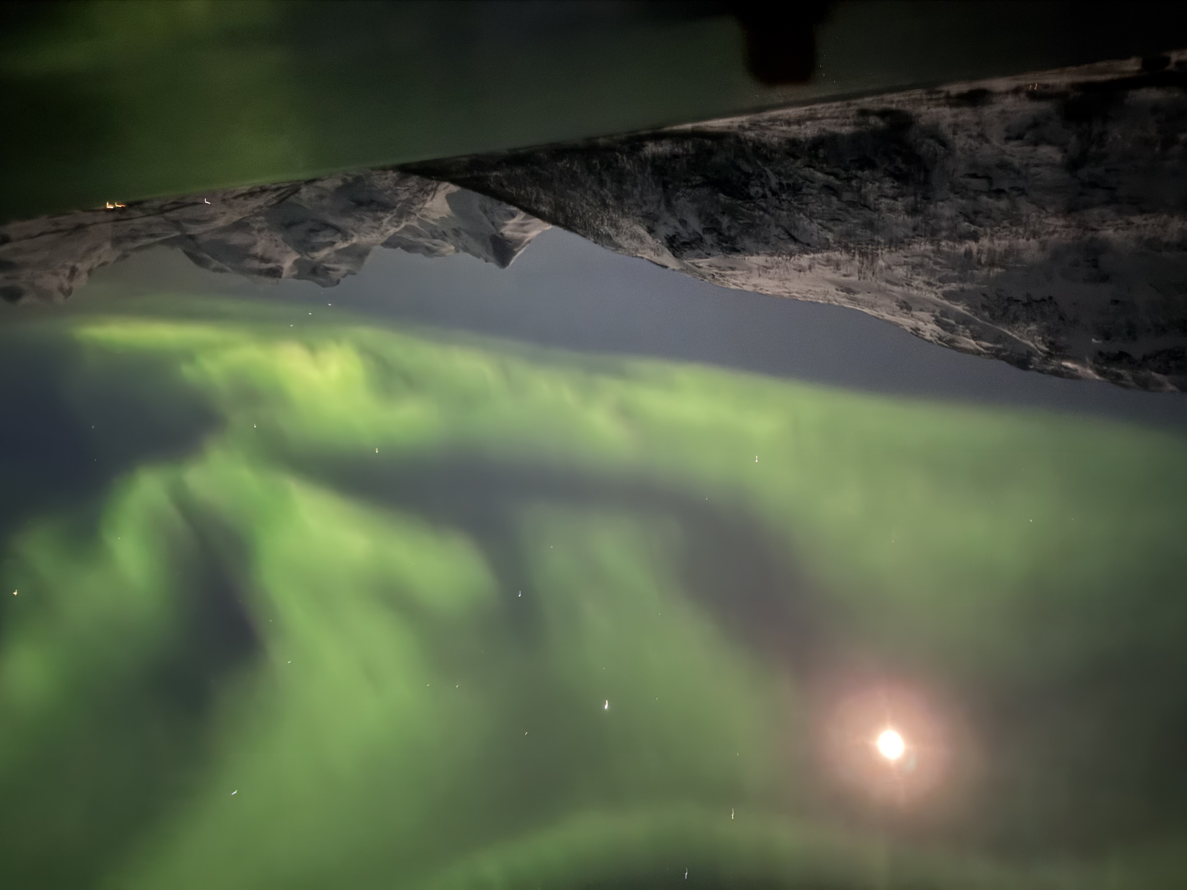 - Incredible evening aurora trip (starting out with a vue panoramique at Skulsfjord while the sun set, then the best display at Lyfjord); thanks Sun, the lights were literally even visible while the sun was up
