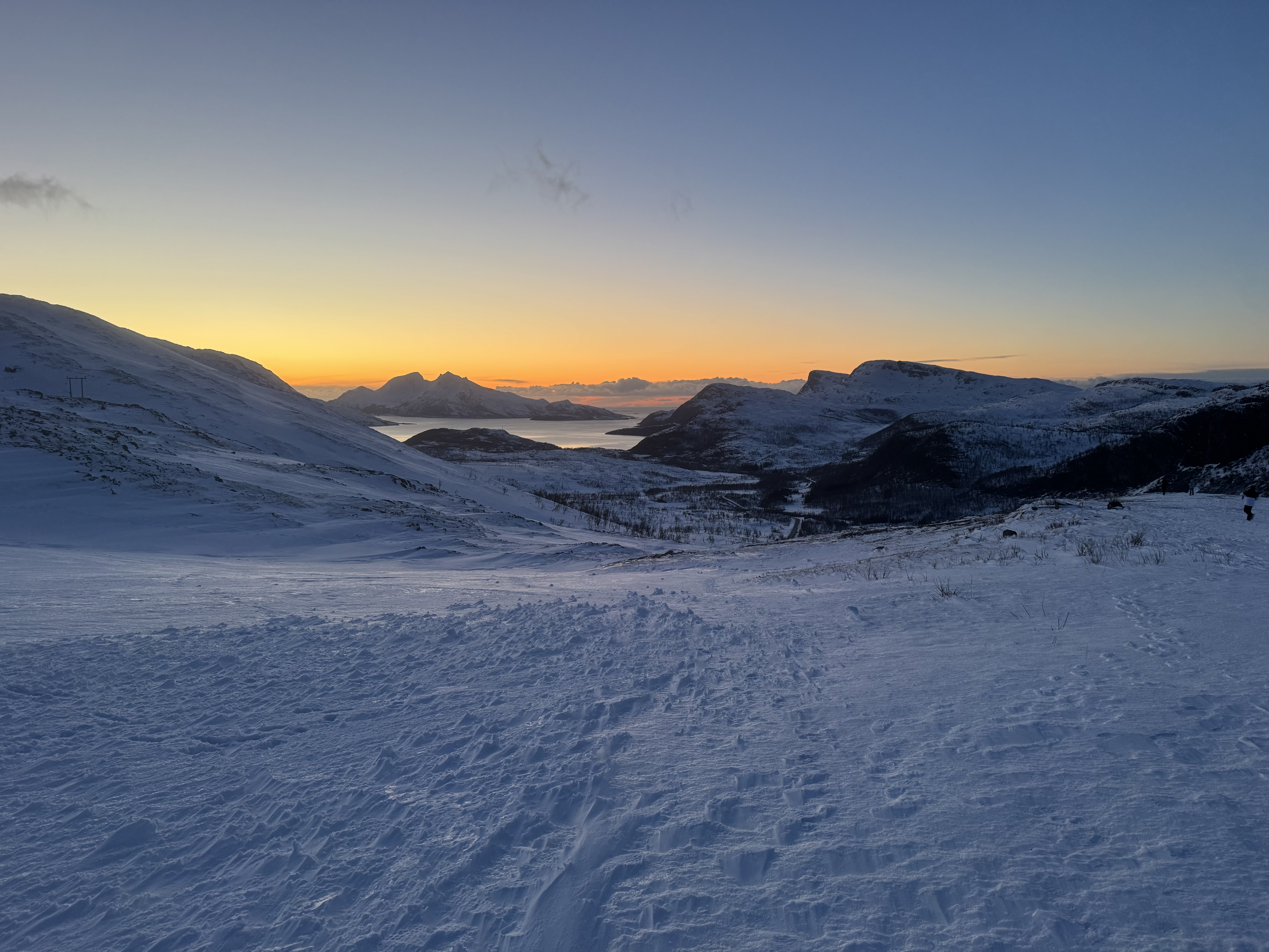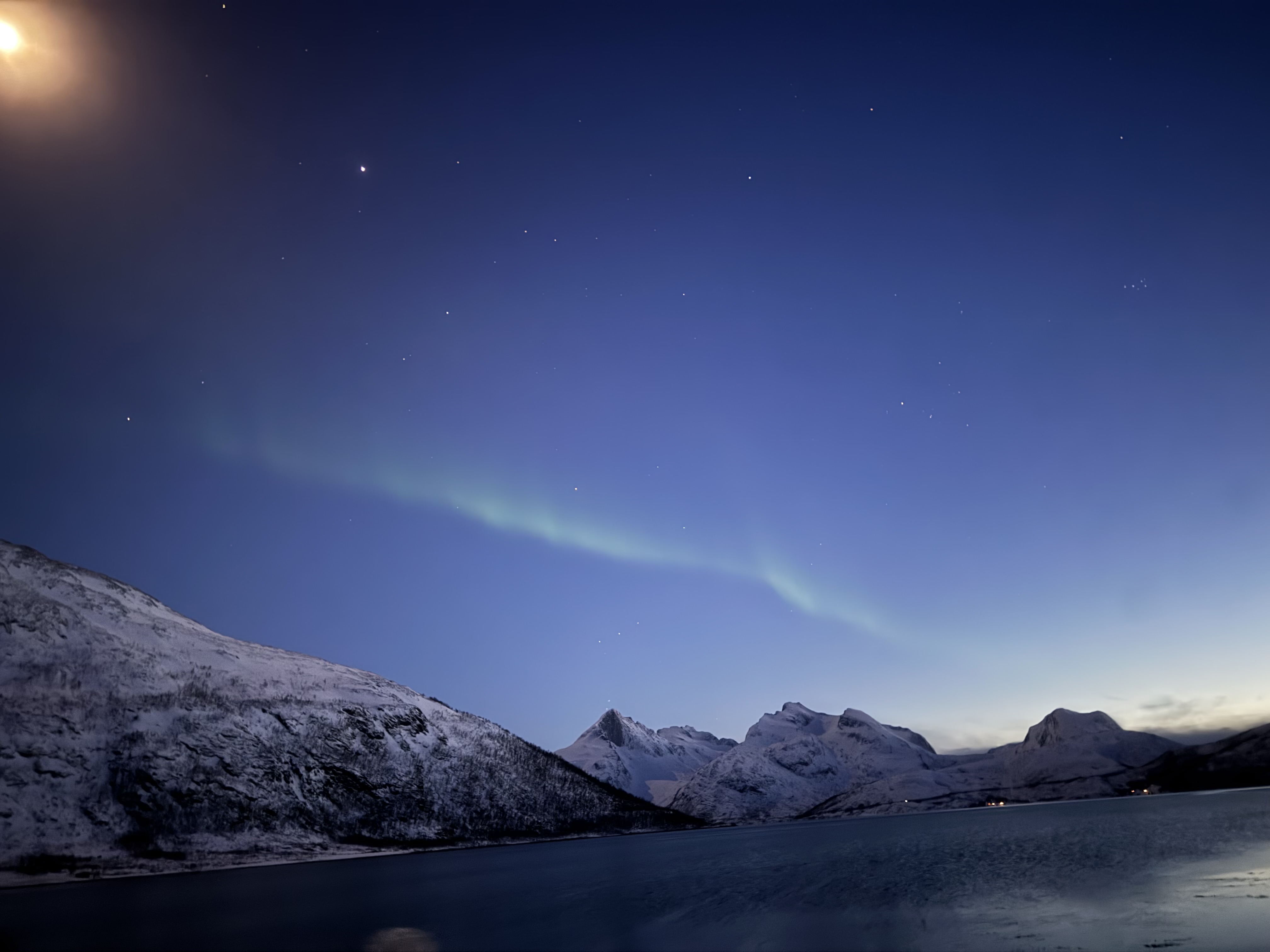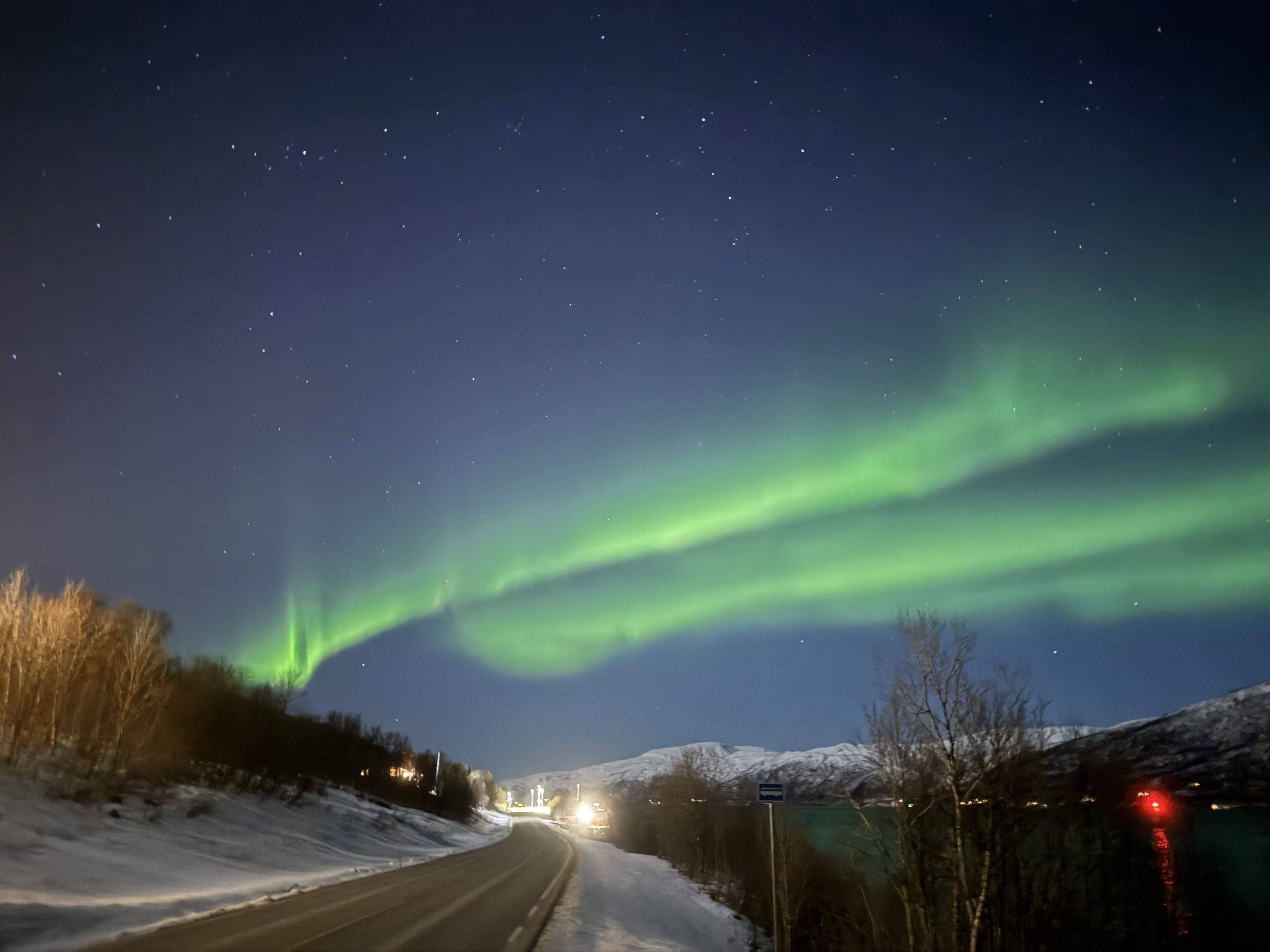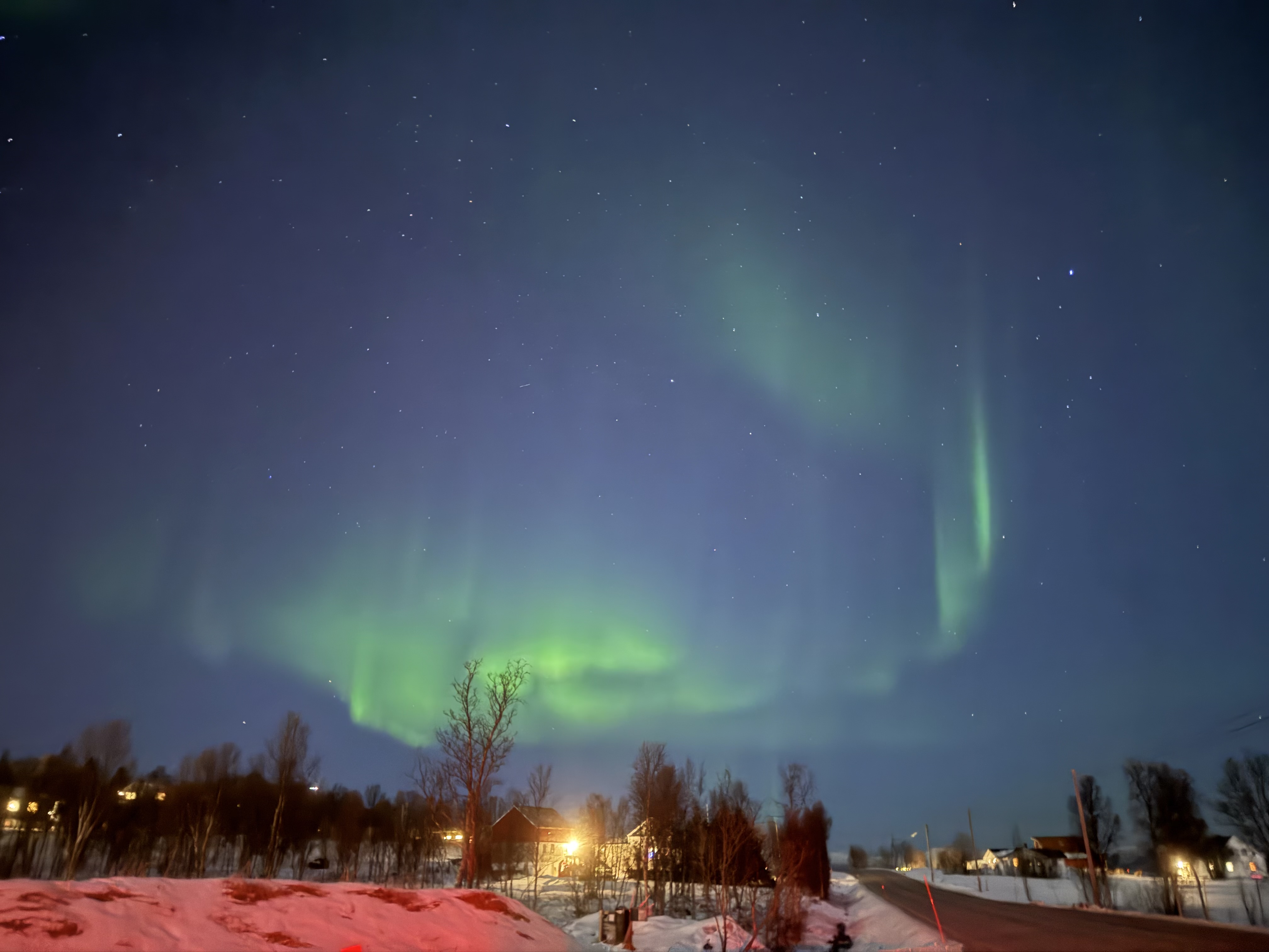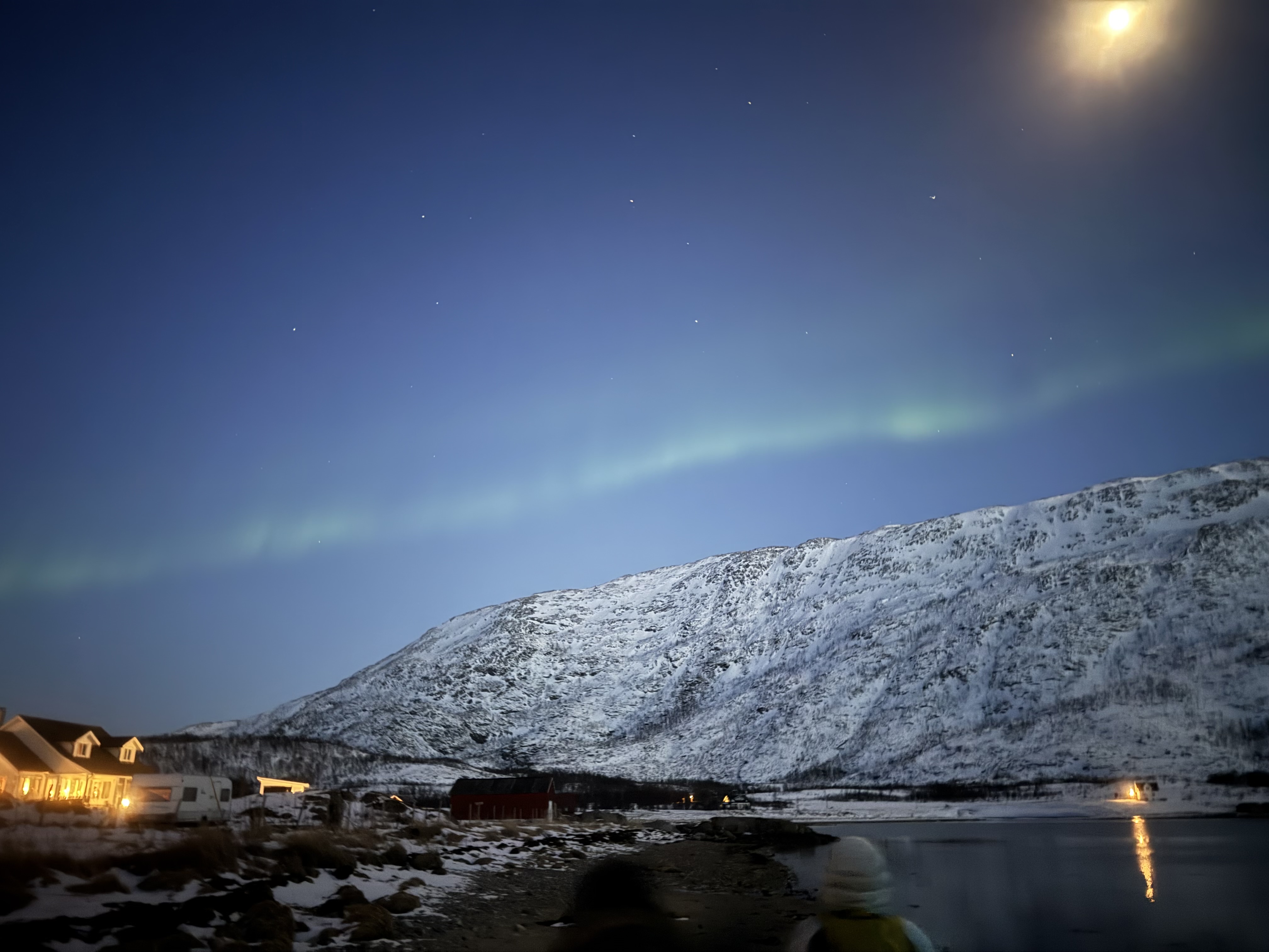 - Incredible evening aurora trip (starting out with a vue panoramique at Skulsfjord while the sun set, then the best display at Lyfjord); thanks Sun, the lights were literally even visible while the sun was up