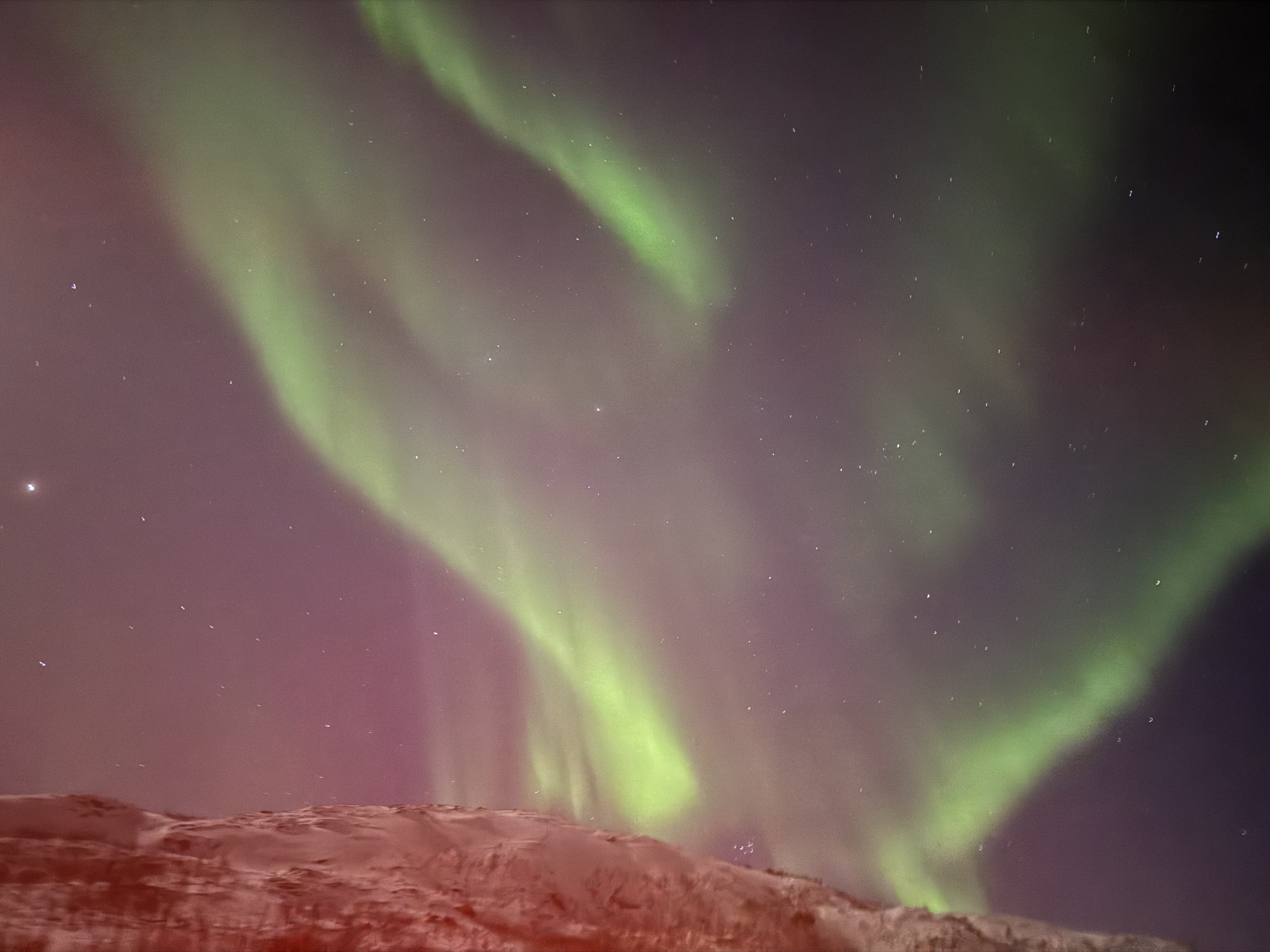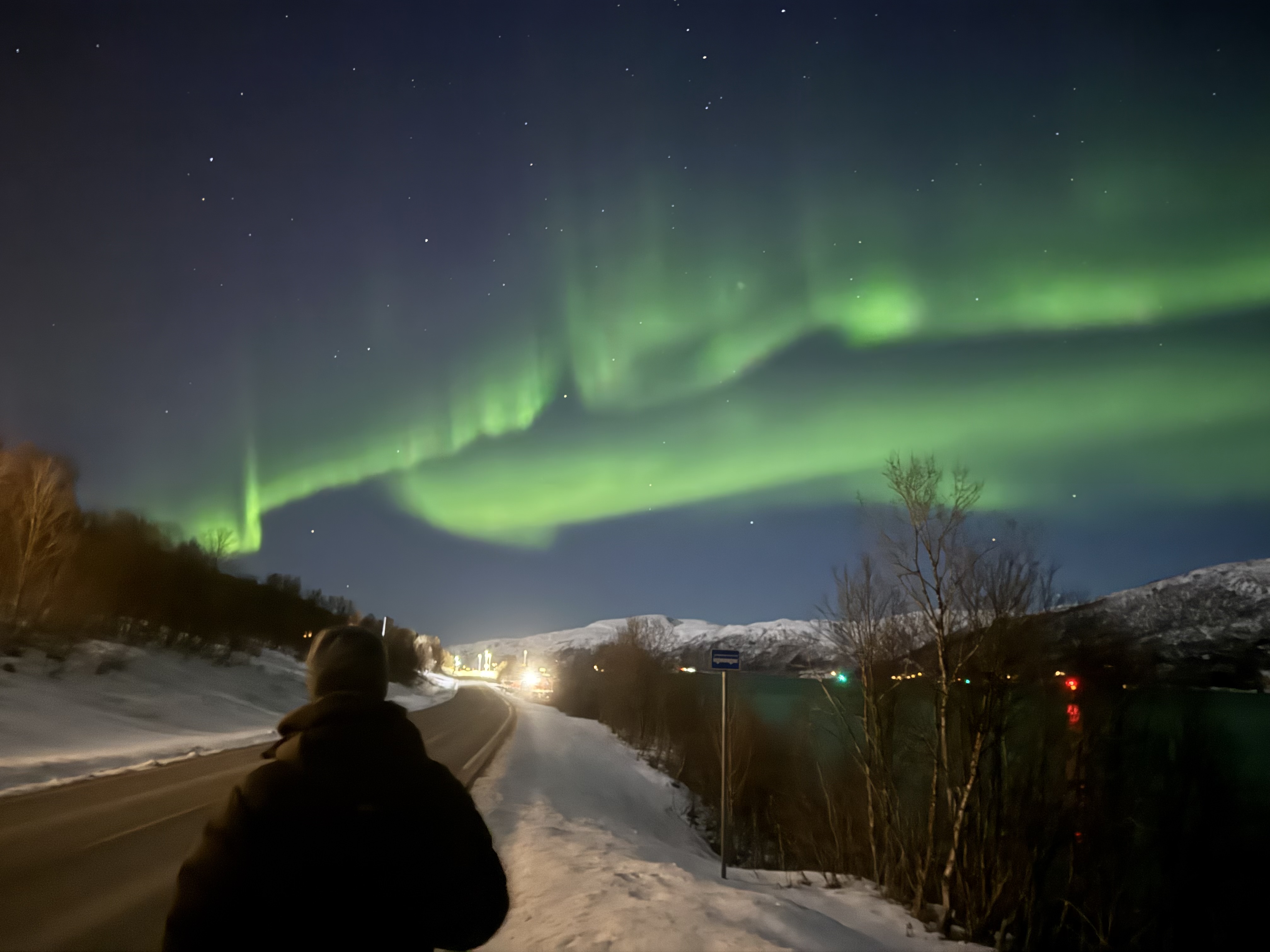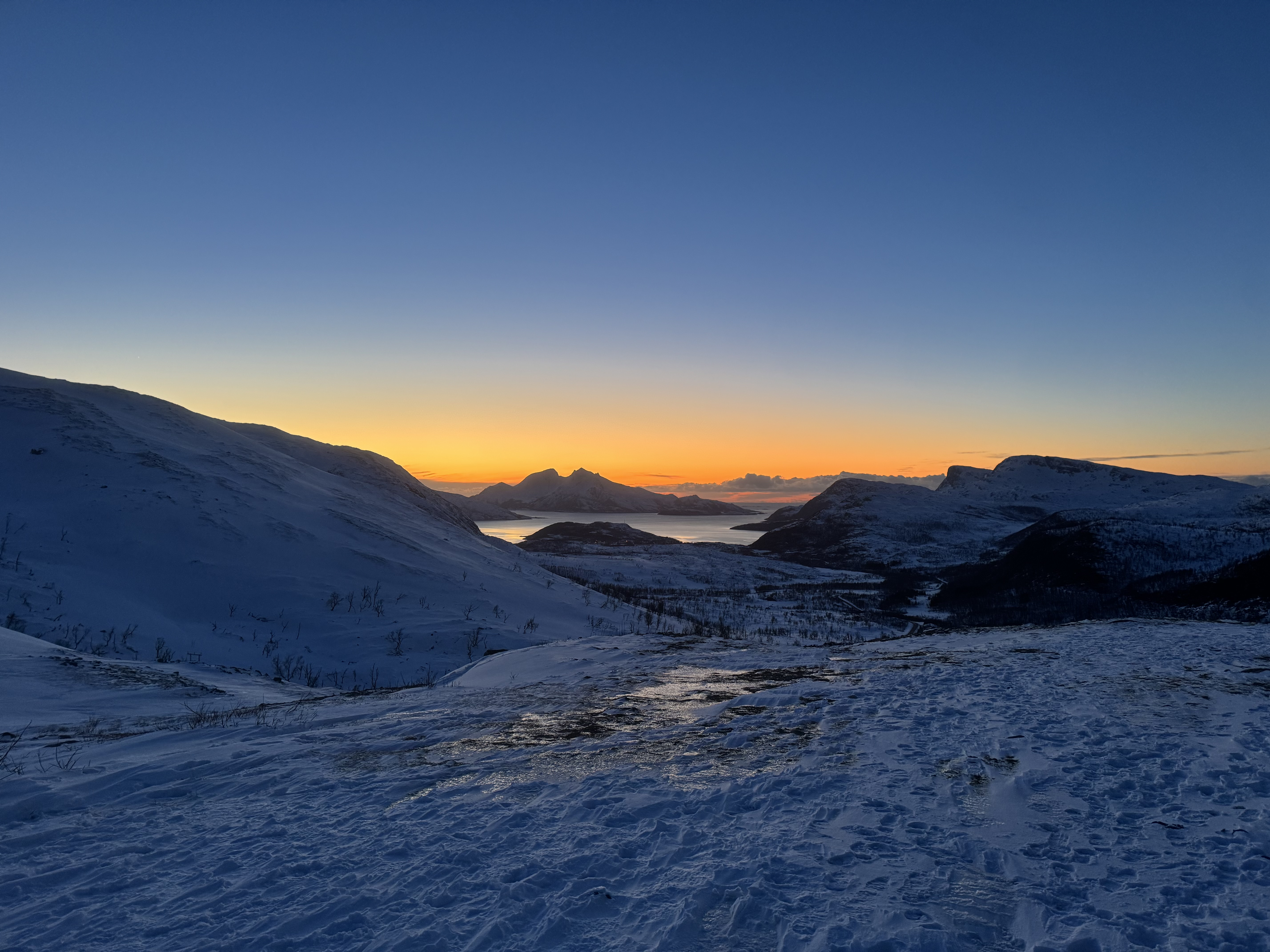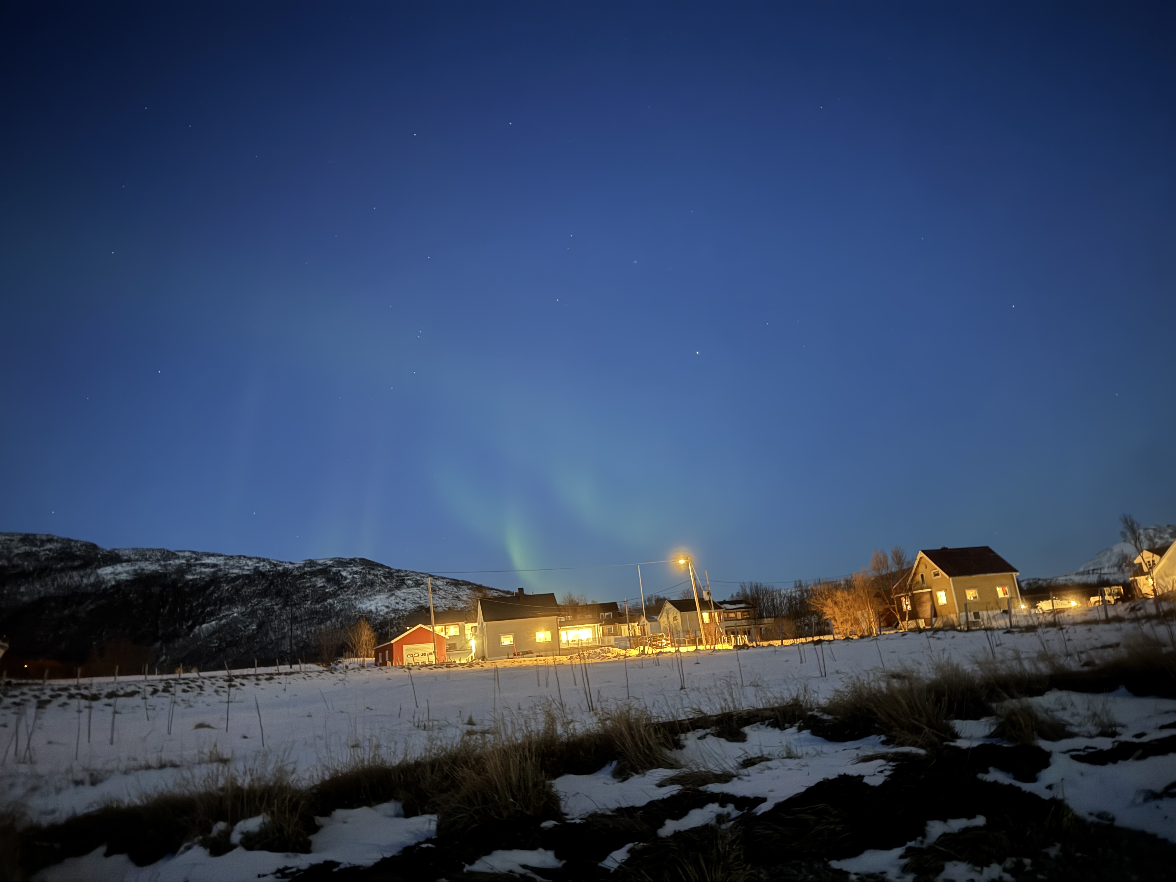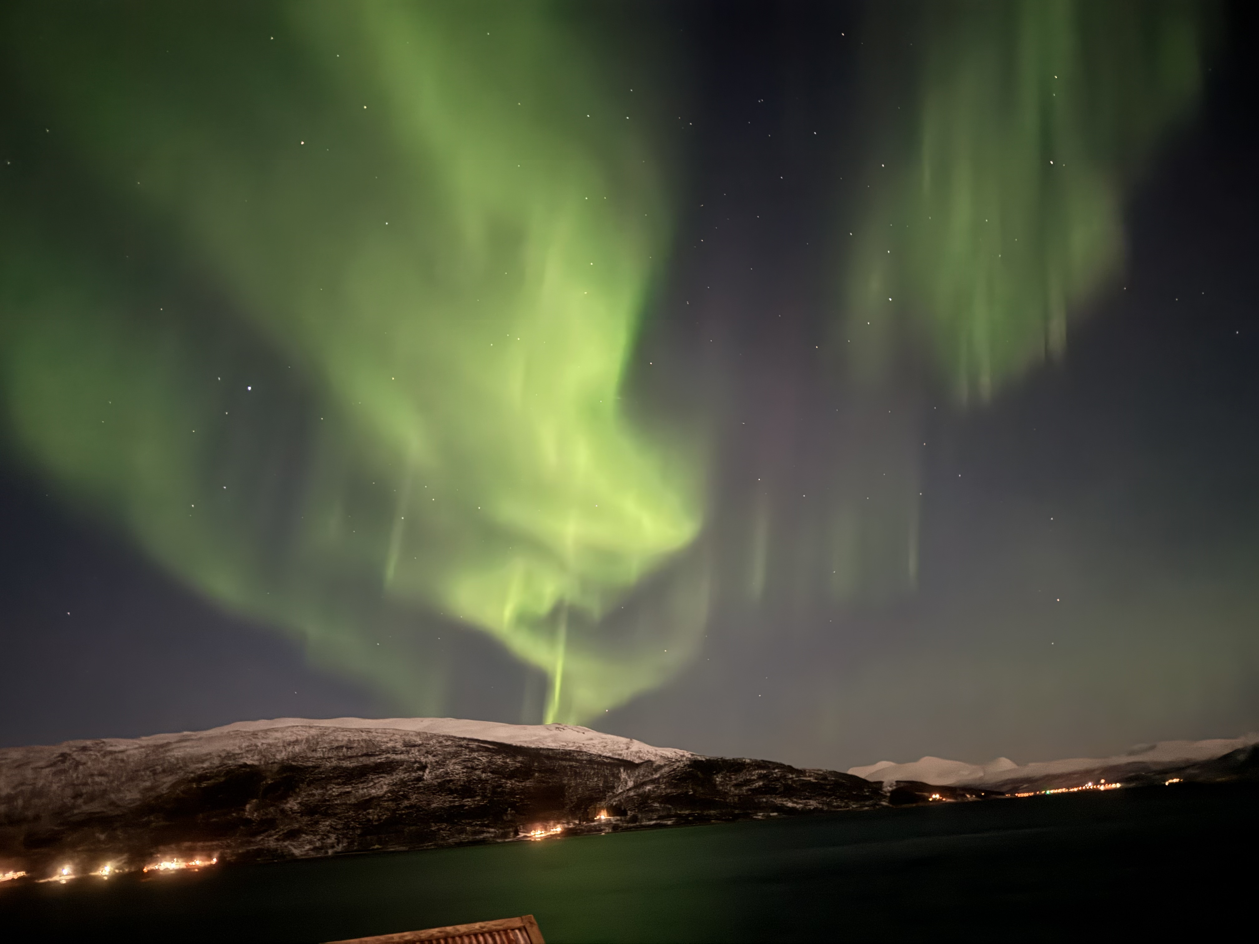 - Incredible evening aurora trip (starting out with a vue panoramique at Skulsfjord while the sun set, then the best display at Lyfjord); thanks Sun, the lights were literally even visible while the sun was up