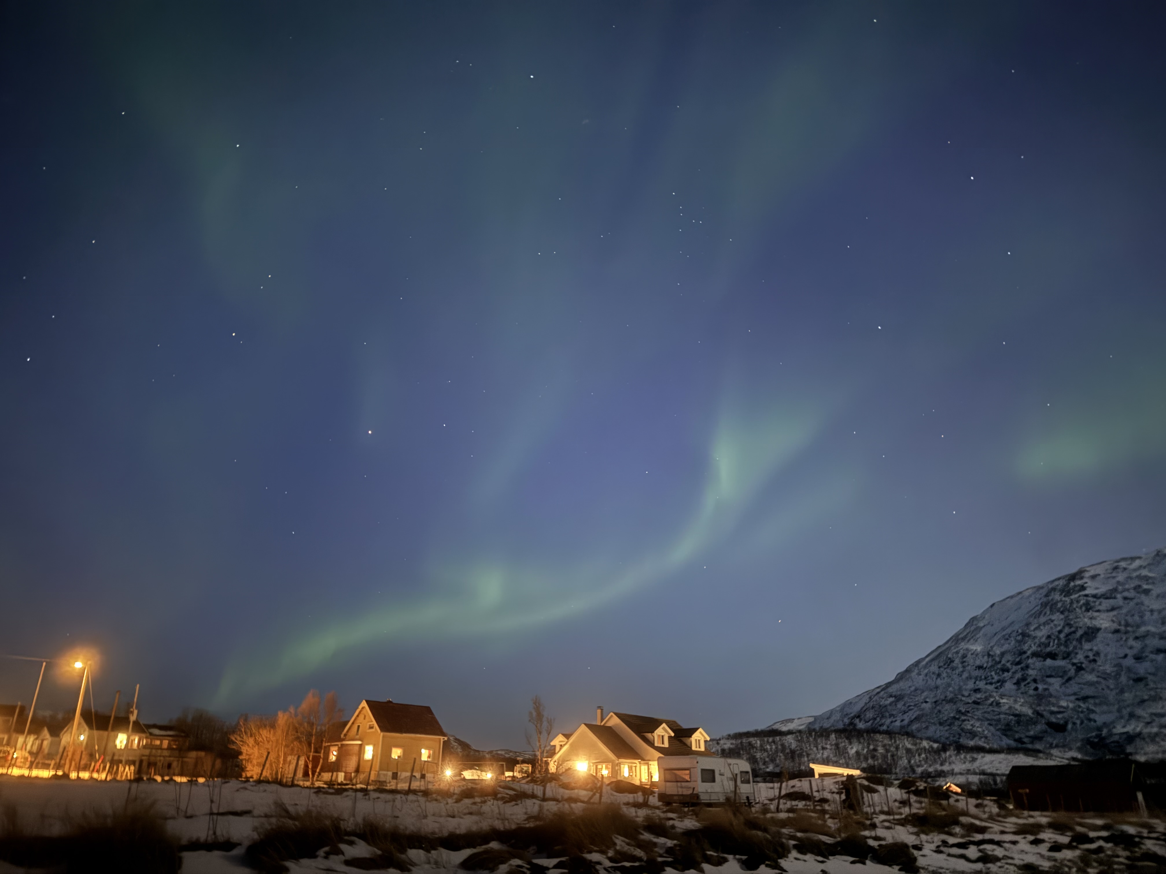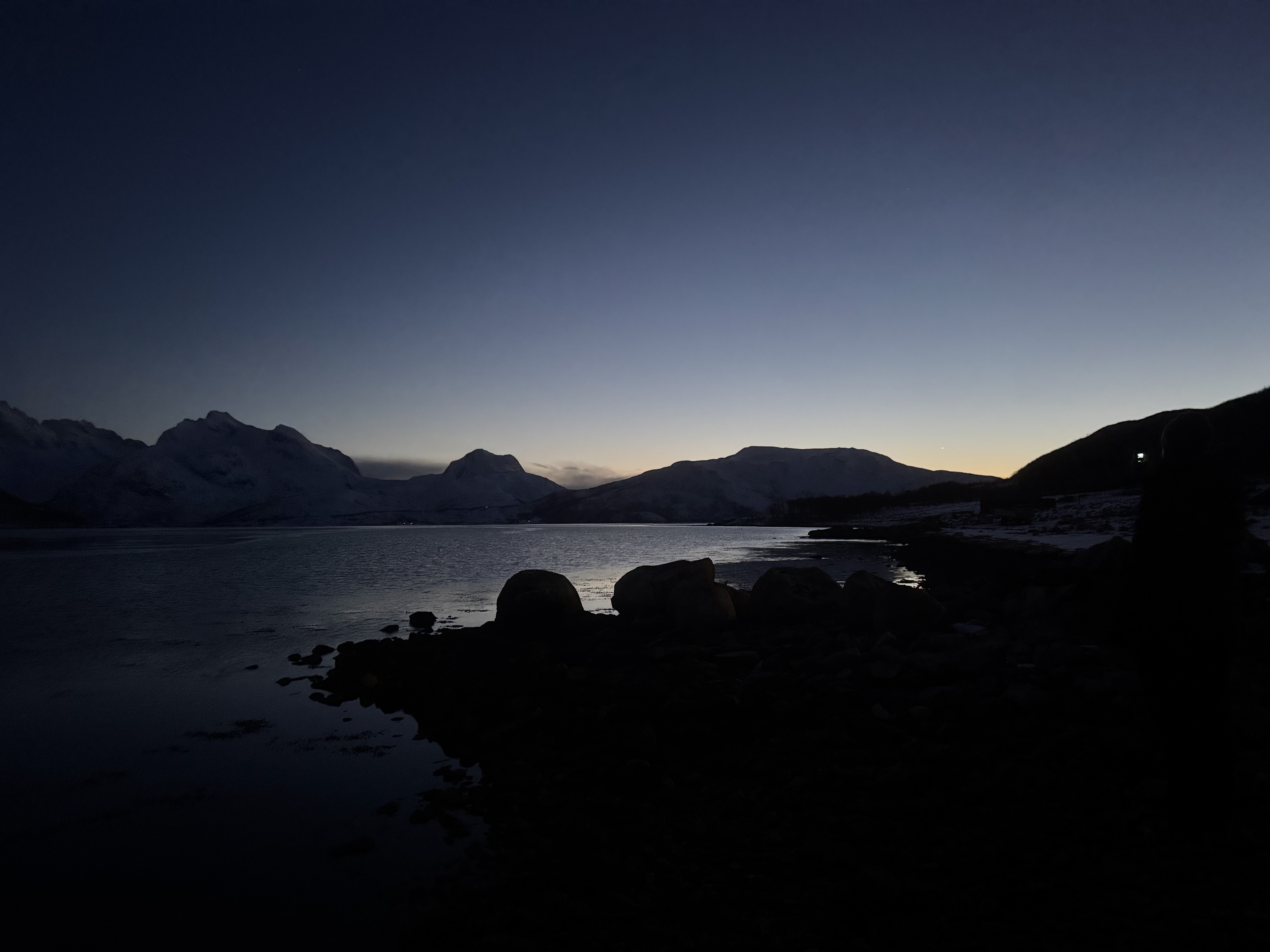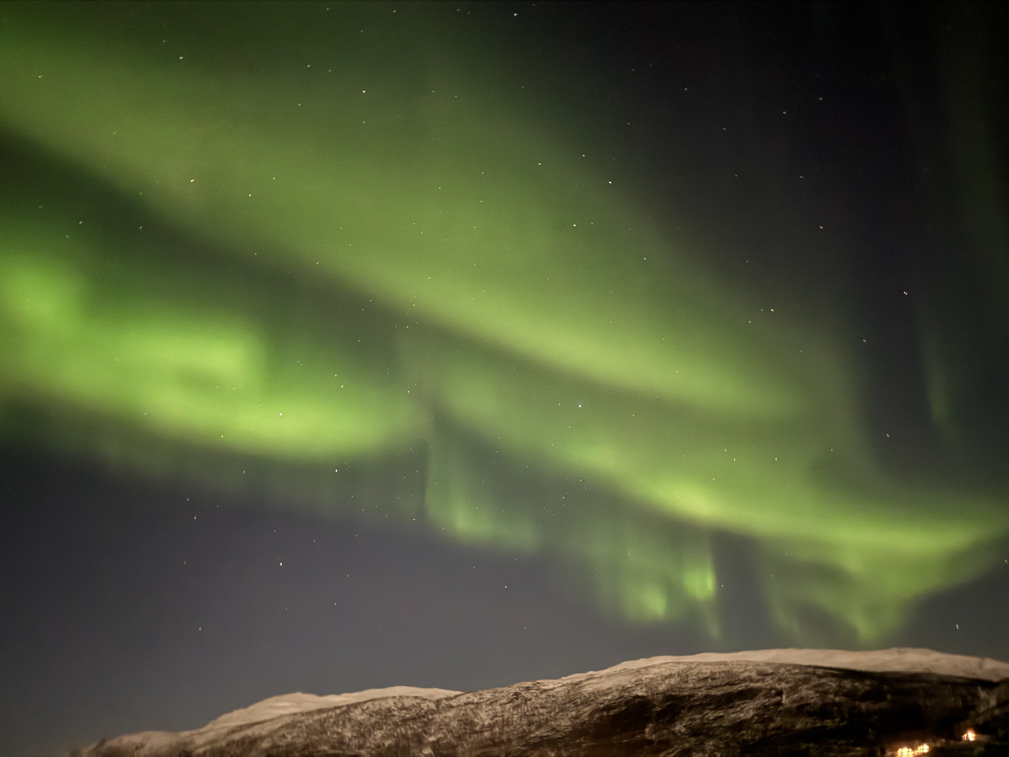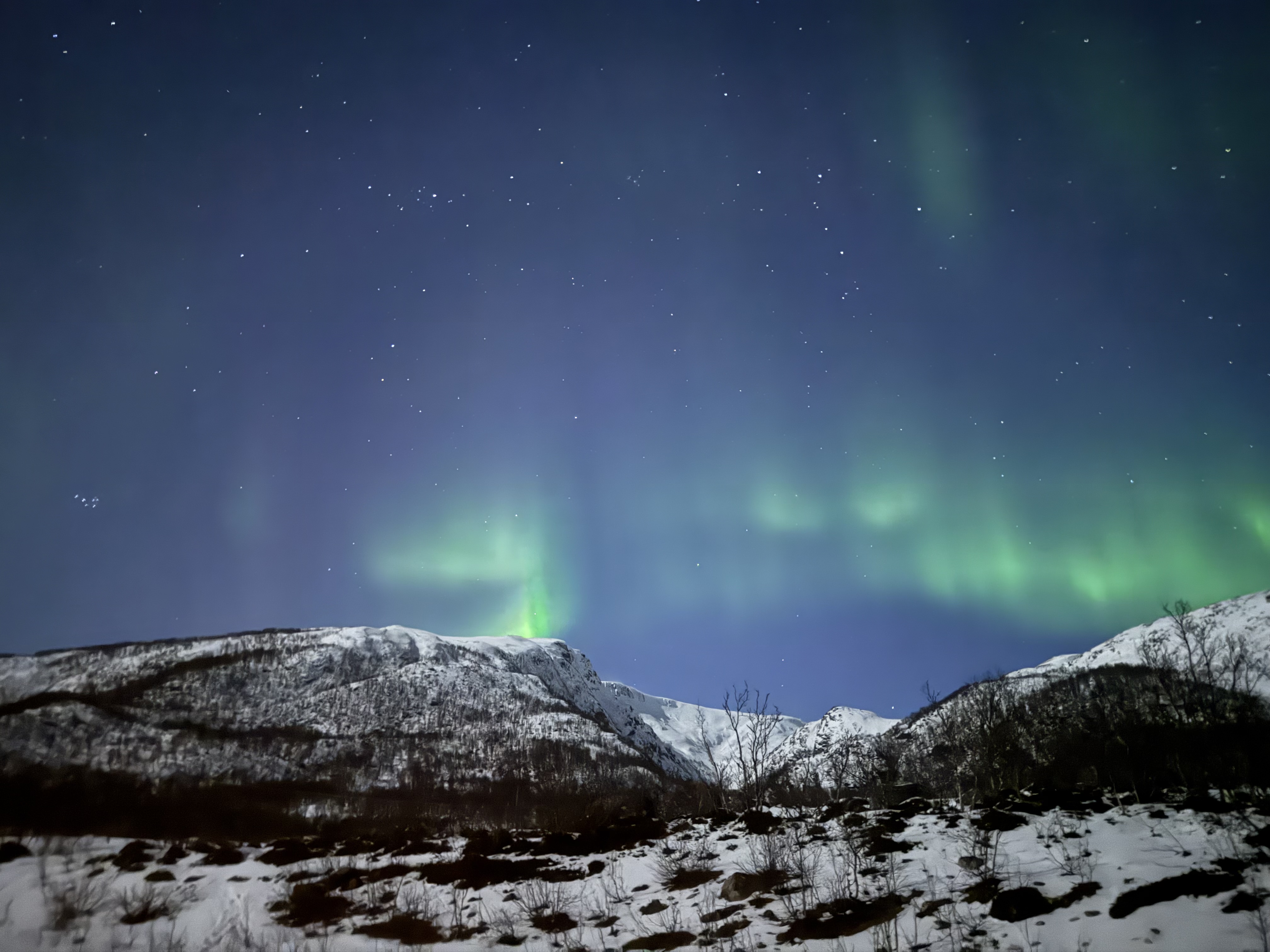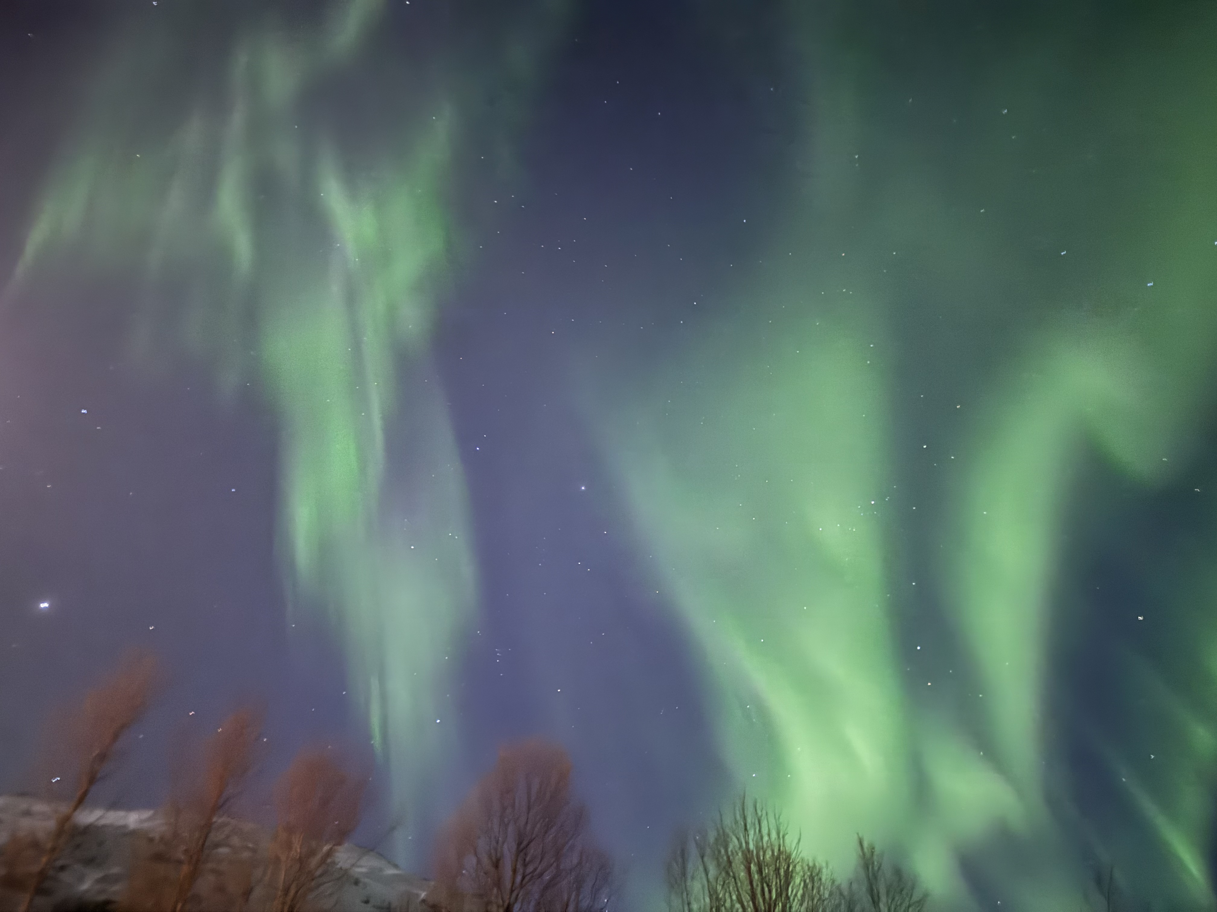 - Incredible evening aurora trip (starting out with a vue panoramique at Skulsfjord while the sun set, then the best display at Lyfjord); thanks Sun, the lights were literally even visible while the sun was up